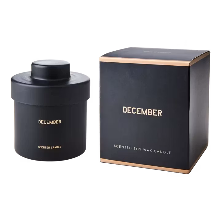 Doftljus av soyavax i fin plåtburk med lock. Levereras i fin pappkartong. Decembers doft är saffron, raspberry, thyme, lite julig men ändå frisk av hallon och timjan.