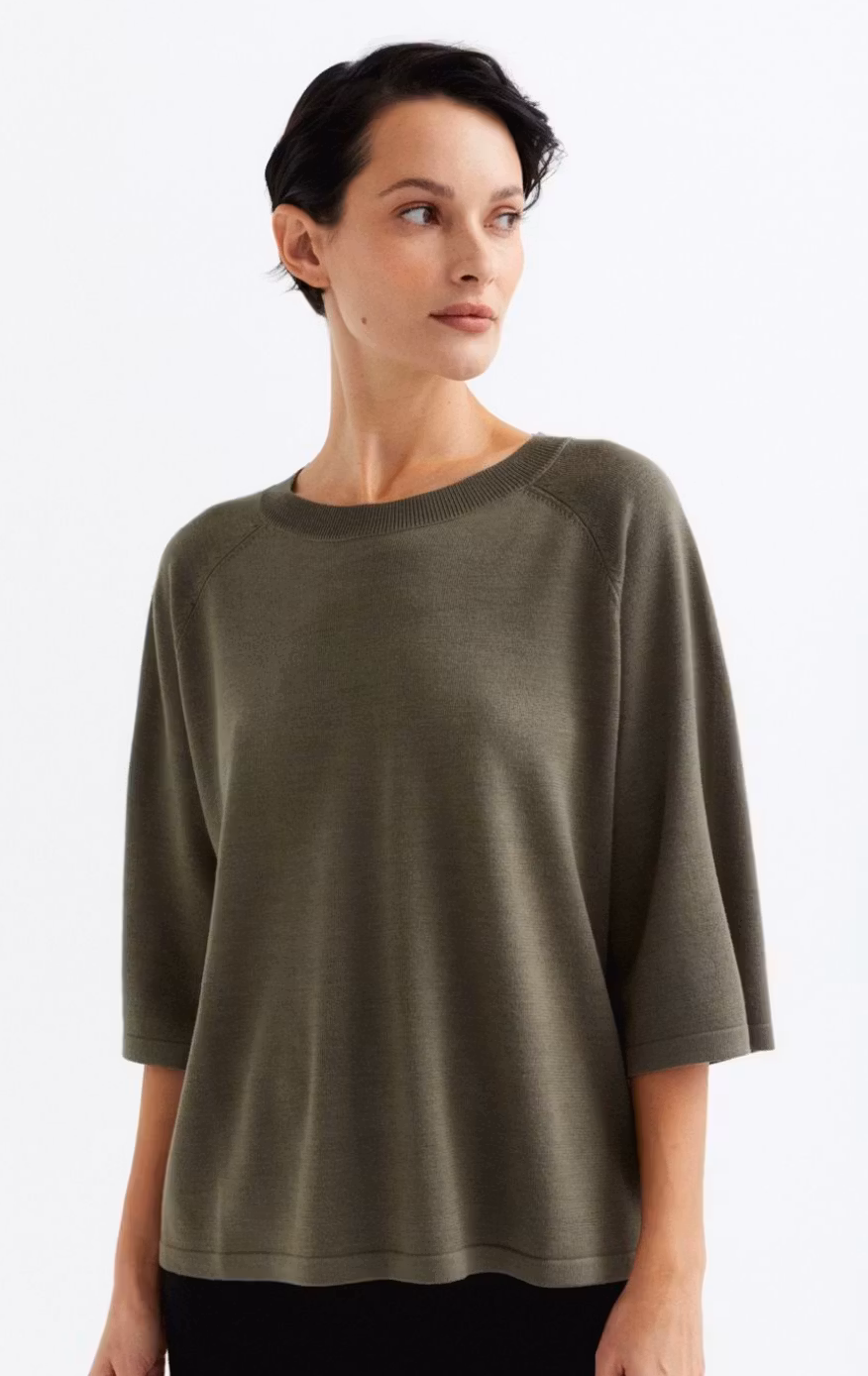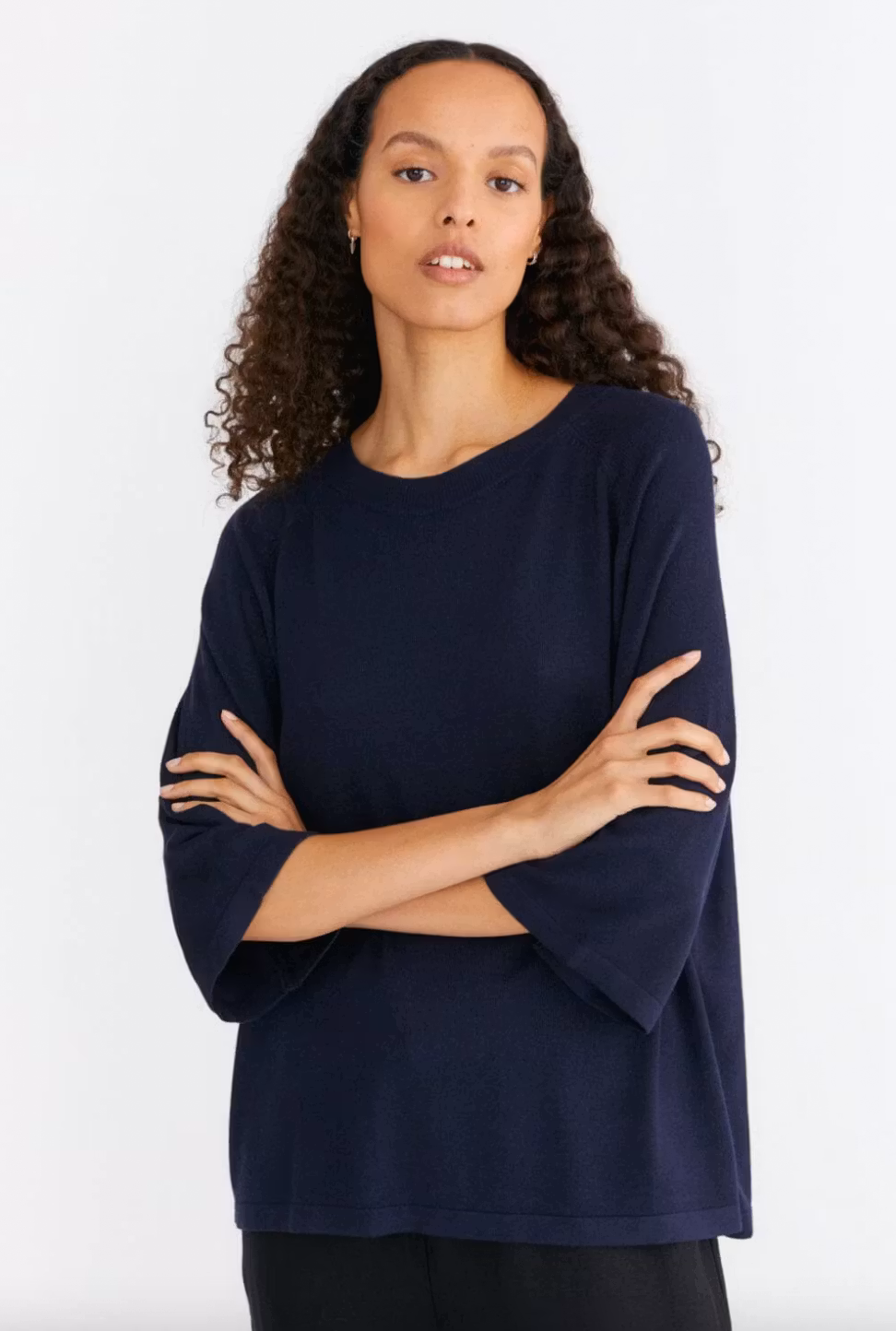 Tunnstickad top i stor lite lös modell, med trekvartslång raglanärm med fina stickade detaljer. Materialet är skönaste bambu med cashmere.