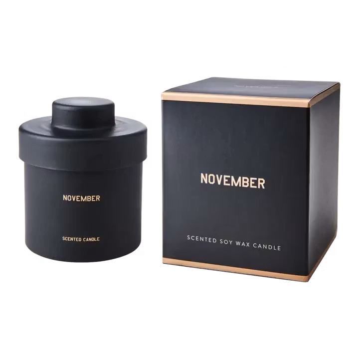 Doftljus av soyavax i fin plåtburk med lock. Levereras i fin pappkartong. Novembers doft är Hazelnut & Oat, lite murrig och mustig och passar fint på hösten.