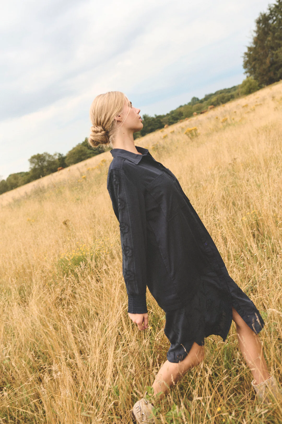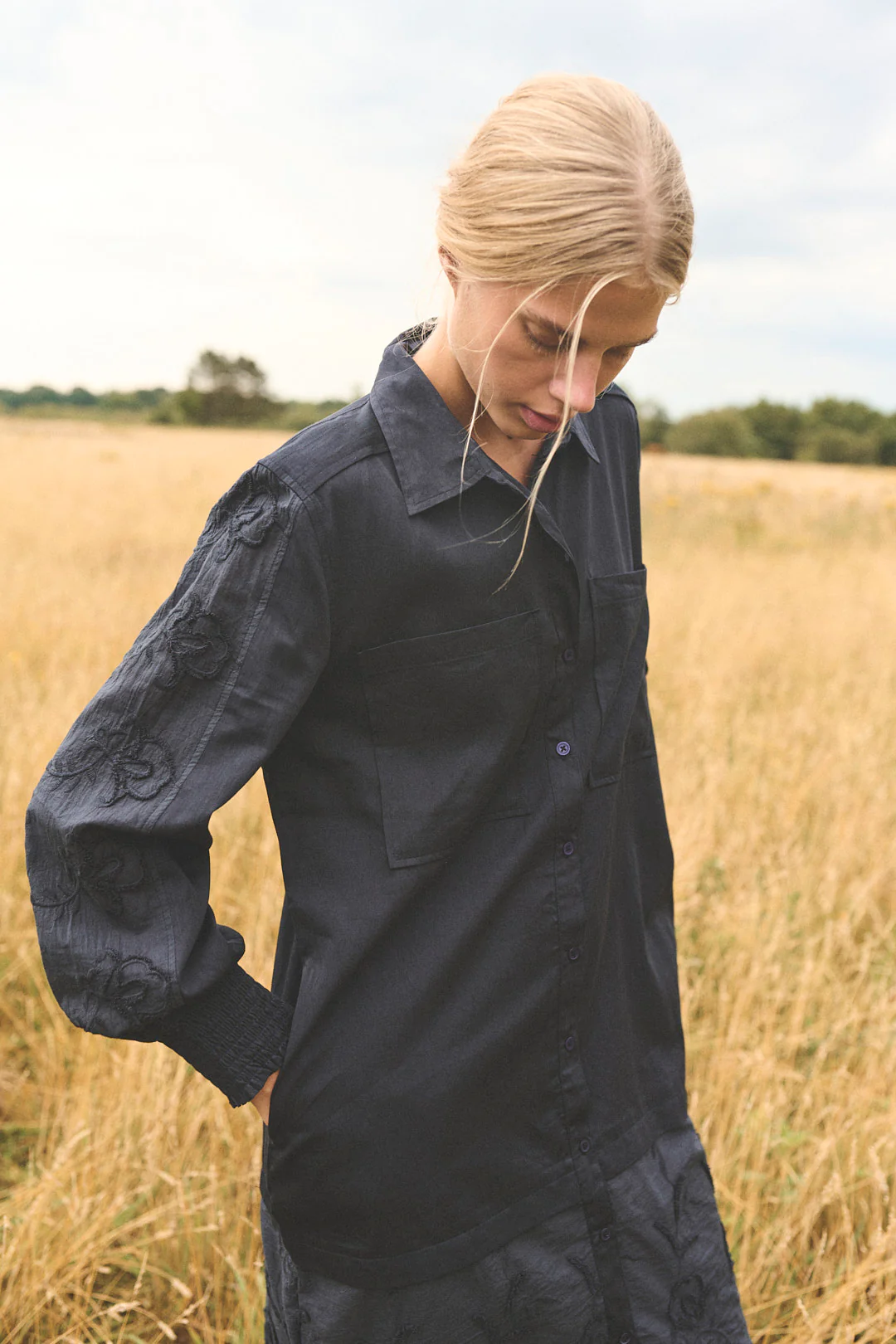 Skjortklänning i bomull, med lång ärm och fickor, fint brodyr nedtill. Färgen är mörk midnatssblå.