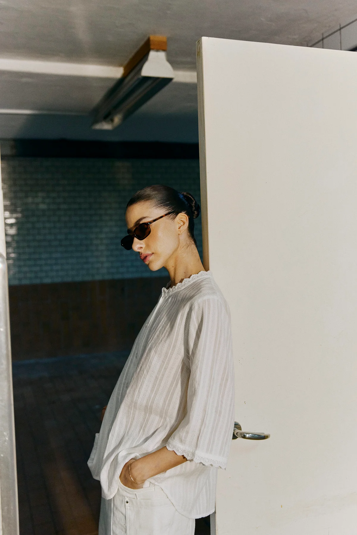 Vit bomullsblus, med fin struktur i tyget. Trekvartsärmar och öppen rygg med två knyten.