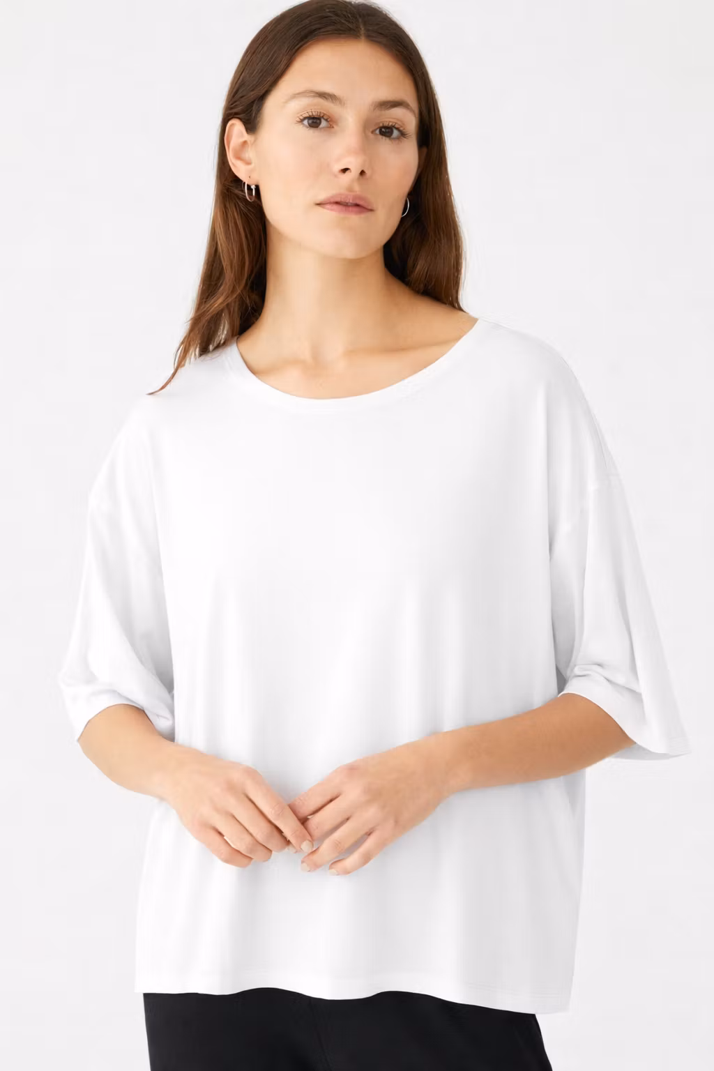 Skön t-shirt top i mjukaste bambulyocell. Oversise i modellen, vilket blir fint i detta material, som får ett vackert fall. Trekvartsärm och lätt båtringad.