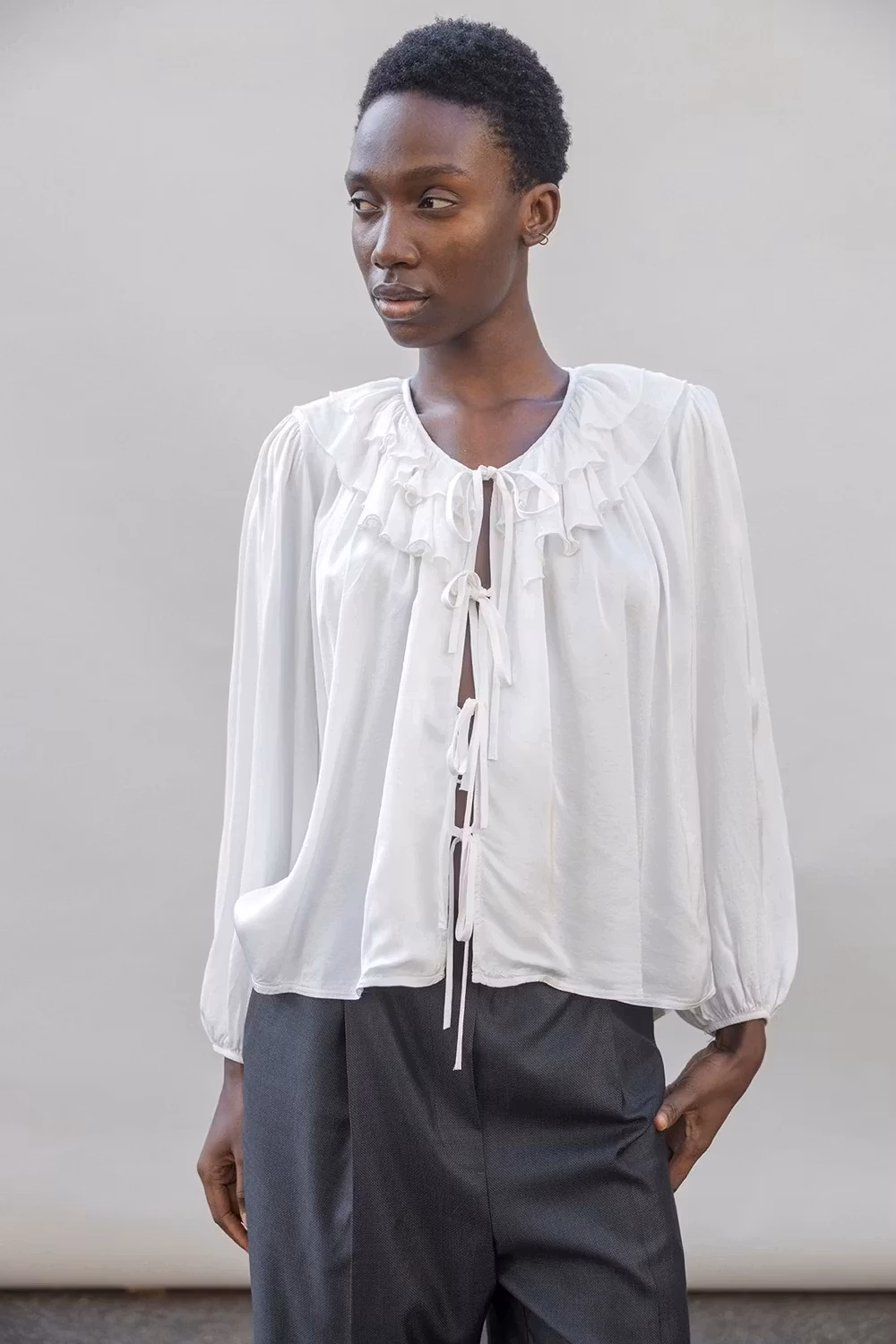 Blus med volang och knytband framtill. Lite kortare ärm med puff.