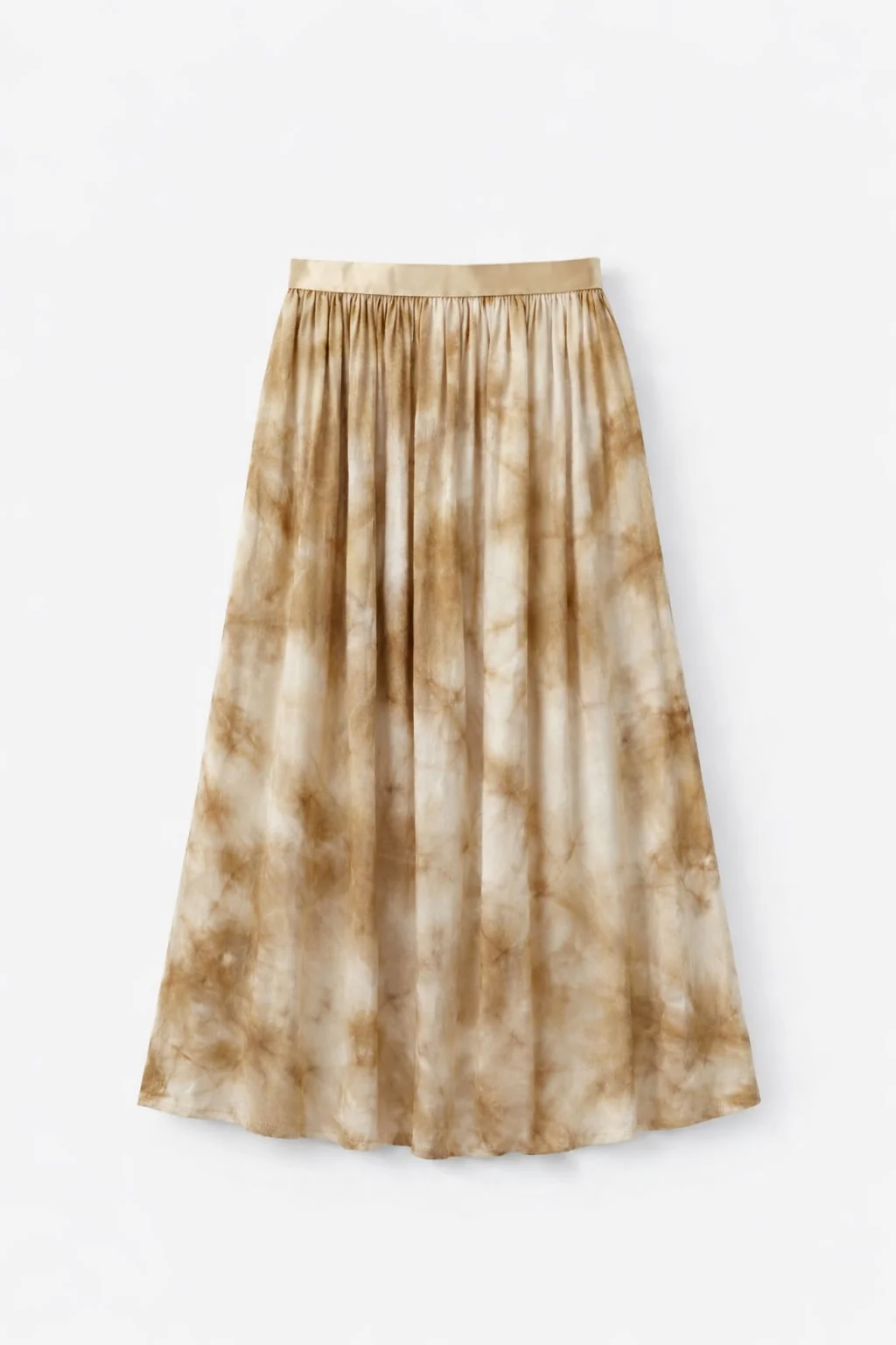 Vadlång kjol, i batikfärgat mönster i sandfärg. Fickor i sidorna och resår baktill. Materialet är slinkigt skönt viscose/silk.