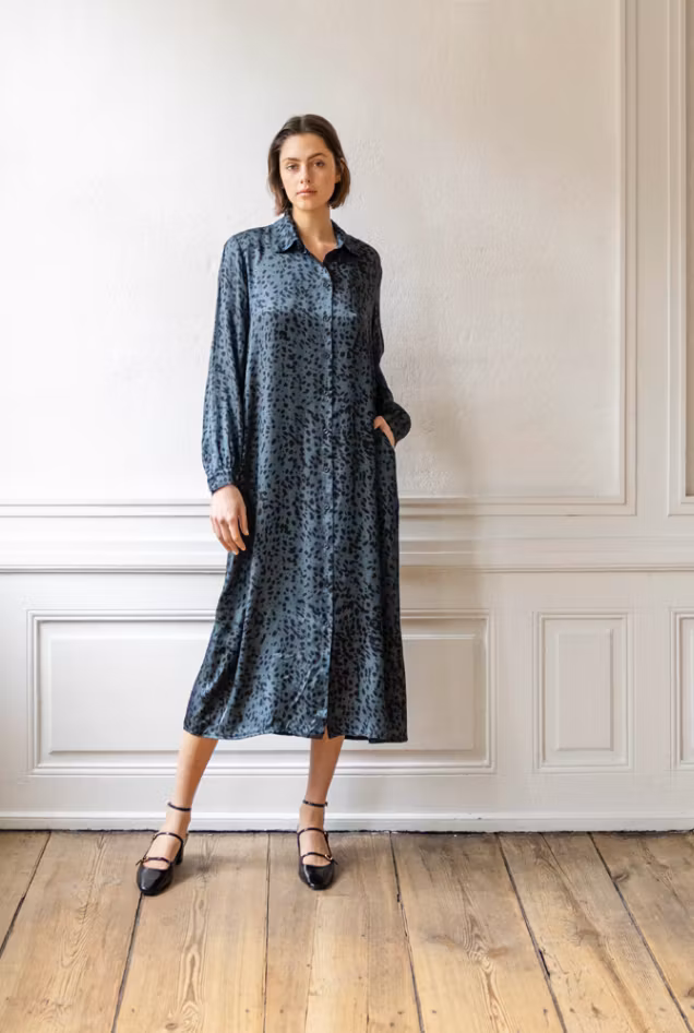 Skjortklänning i fin petrolfärg, med svart leoprint. Klänningen har knappar hela vägen fram och kan bäras öppen också över byxa och top.
