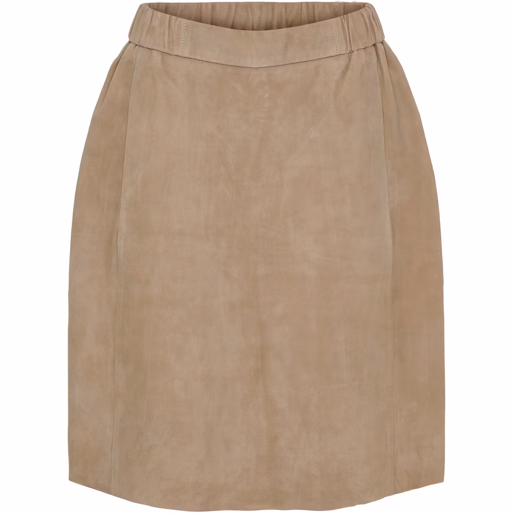 Knälång mockakjol i ljuvlig sandbeige mocka. Samma modell som vår populära a-formade längre kjol, men denna i kort version. Resår baktill och fickor i sömmarna framtill.